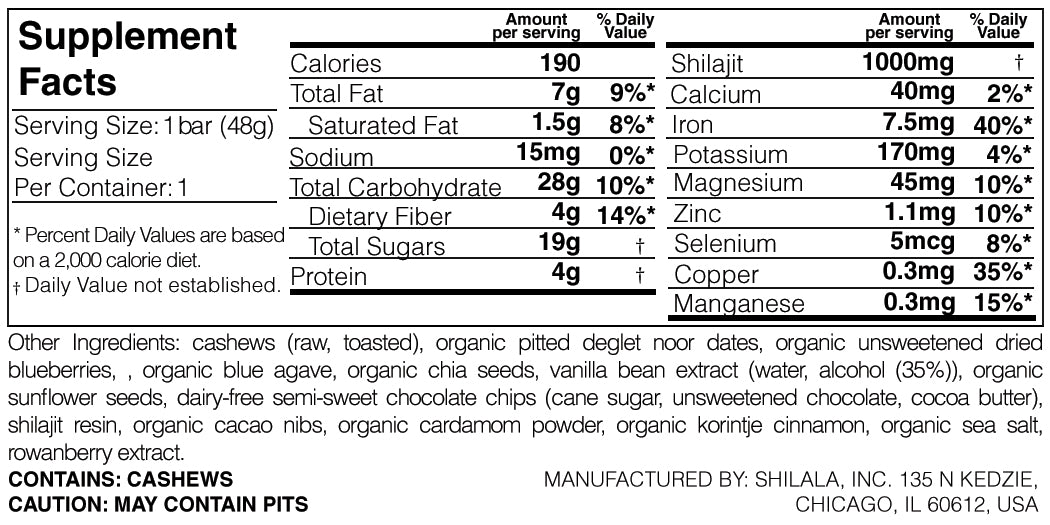 cashews (raw, roasted), organic pitted deglet noor dates, organic dried blueberries, agave, organic chia seeds, vanilla extract (water, alcohol (35%)), organic hulled sunflower seeds, dairy free semi sweet chocolate chips (cane sugar, unsweetened chocolate, cocoa butter), shilajit resin, organic cacao nibs, organic cardamom powder, organic Korintje cinnamon powder, sea salt, rowanberry extract